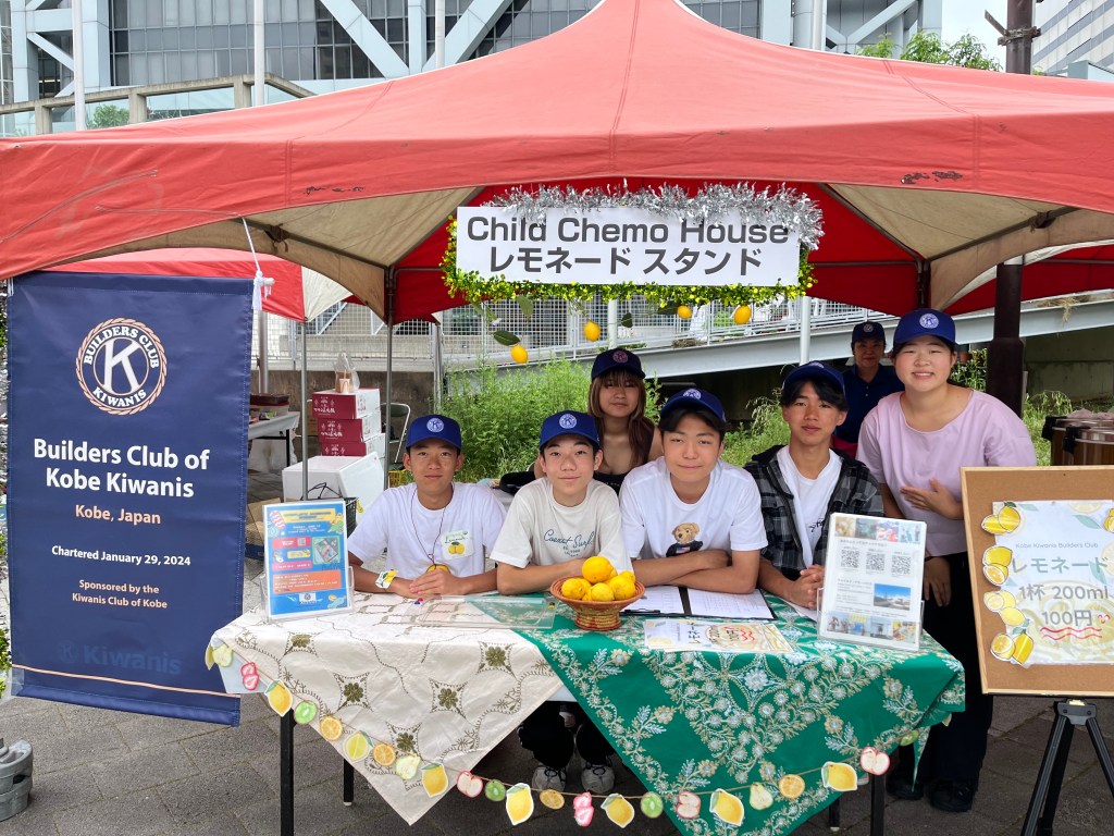 We held a lemonade stand for Child Chemo House May 2024. Child Chemo House is an accommodation facility for pediatric patients battling cancer and other intractable diseases and their families at Kobe City Medical Center Chuo Municipal Hospital and other facilities on Port Island in Chuo-ku, Kobe City. The lemonade stand sold 850 cups and raised 135,460 yen, which was donated to Child Chemo House in the amount of 100,000 yen. Kiwanis Club members and Satellite Club members also assisted us.